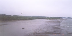 | 雨はあがりましたが、太陽が出るまではいかず、最高気温は20度といったあたりか、寒い。大樹町を流れる、清流「歴船川」昨日も見たのですが、雨が上がってから12時間たっていましたが、まだ、茶色の水が流れるばかりでした。 この日は、歴船川の他、豊似川、野塚川、楽古川を見ながら襟裳岬を目指したのですが、歴船川以外のこれらも結構大きな川で水量も多いのですが、水のにごりはまったくといっていいほどありませんでした。十勝管内のこのあたりの川は、北海道でも、格別に透明で、水量も多く、ピカ一のよい川が多くあります。 大樹町の町の外れには、あの有名な「雪印」がありました。現在は、工場が再開されているようですが、人の気配がなく寂しい感じでした。 |