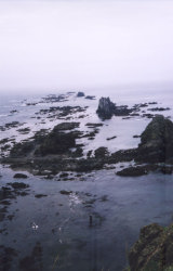 | 左の写真は、日高山脈の連なりが海に消えていく場所です。双眼鏡では、「コ゜マフアザラシ」が無数に、岩の上や海の 中に顔を出しているのが見えました。 |