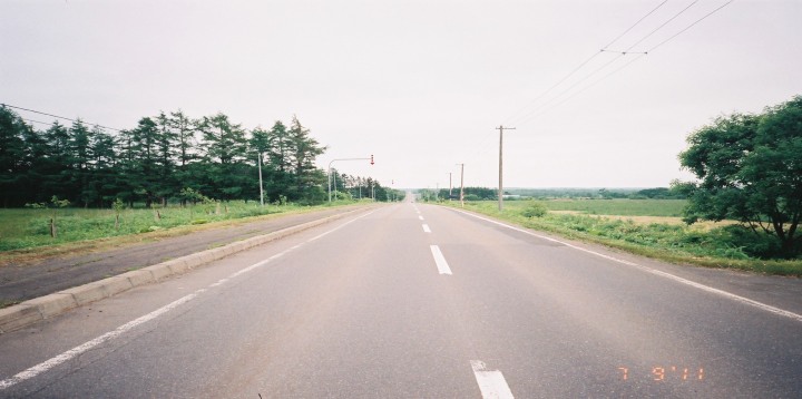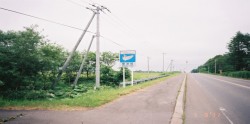 | 上の写真と同じ様になにやら真っ直ぐな道ですな。 標津(しべつ)の町に入りました。 東京は30度でしたが。中標津の気温は16度。サイクリングをするには丁度よい気温です。服装は、いつものように半ズボンといつもはTシャツなのですが、今回は長袖のシャツです。 |