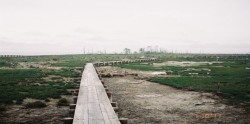 荒涼とした風景。木道を歩き見学する。途中から遂に雨が降り出す。