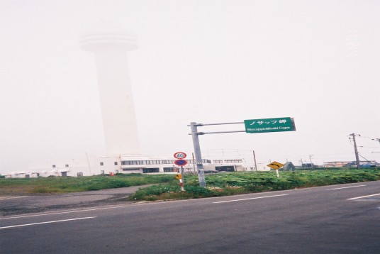 | 7時45分の納沙布岬行きバスに乗車。 納沙布は、今回で4回目なので、行かなくてもいいのですが、根室まで来たからには、納沙布岬ですよね。 しかし、かなり濃い霧ででかい塔もほとんど見えない。この塔は笹川さんが造ったのではなかったかな。 |