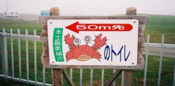 | 浜中町の海沿いの道はほとんど登りと下り。 途中、ムツゴロウ王国との道路標識。1.2キロ、行く気も起きない。 今思いおこすと、この日朝飯だけで、飴玉と水だけだった。 |