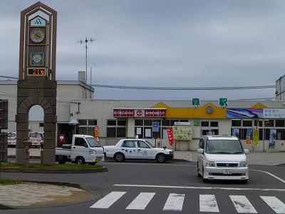 | 森駅。海の近くで、国道5号線は坂の上を通過していて、道の駅は国道沿いにある 右に森のいかめしの売店がありました |