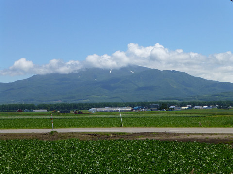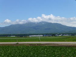 斜里から491メートルの根北峠を越えて標津に向かいます。見えているのは、斜里岳です。