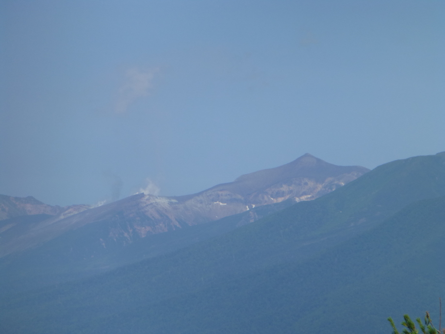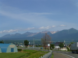 | 富良野あたりは、浦和と同じ感じで、北から、上富良野、中富良野、富良野、南富良野となります。 写真は、上富良野の十勝岳方面です。 噴煙を上げている所があります。 |